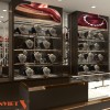 Bước vào bên trong, khách hàng sẽ ngay lập tức bị thu hút bởi tủ quầy trưng bày trung tâm. Quầy có dạng lục giác bo góc mềm mại, giúp tiết kiệm diện tích, tạo sự thoải mái cho khách hàng khi tham quan. Chất liệu tủ kệ kết hợp giữa khung gỗ MDF cốt xanh chống ẩm phủ laminate màu nâu trầm, điểm xuyết đường viền inox vàng sang trọng. Mặt kính cường lực trong suốt, chống trầy xước, vừa đảm bảo an toàn vừa giúp sản phẩm bên trong luôn được nhìn rõ ràng.