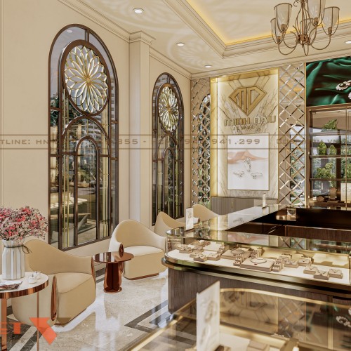 Việc lựa chọn chất liệu, màu sắc và ánh sáng tại khu vực tiếp khách được xử lý tinh tế, mang lại cảm giác thân thiện, ấm cúng nhưng vẫn giữ được sự trang trọng cần có của một cửa hàng vàng cao cấp.