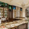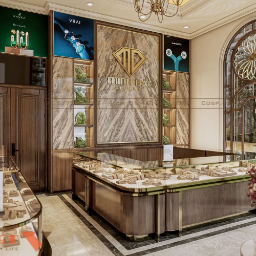 Sự thành công trong bố trí nội thất tiệm vàng Minh Dậu nằm ở việc lựa chọn chất liệu và màu sắc mang biểu tượng phồn vinh. Màu xanh ngọc bích đại diện cho sự may mắn và tiền tài mang yếu tố phong thủy trong kinh doanh ngành kim hoàn.