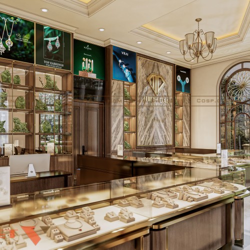 Chiếm phần lớn diện tích không gian sàn, khu vực hệ tủ trưng bày trung tâm được bố trí khoa học với quầy dài hình chữ U, viền cạnh bo cong mềm mại, mang hơi hướng hoàng gia. Bề mặt quầy làm bằng kính cường lực trong suốt, bao phủ toàn bộ các khay đựng trang sức, giúp ánh sáng dễ dàng chiếu xuyên và làm nổi bật từng mẫu sản phẩm.