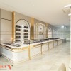 Không gian trưng bày trang sức vàng được bố trí ở trung tâm, với tủ kích thước lớn làm từ gỗ MDF cốt xanh. Thiết kế tủ chữ L giúp khách hàng dễ dàng tiếp cận mọi sản phẩm mà không phải di chuyển quá nhiều.