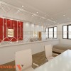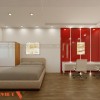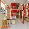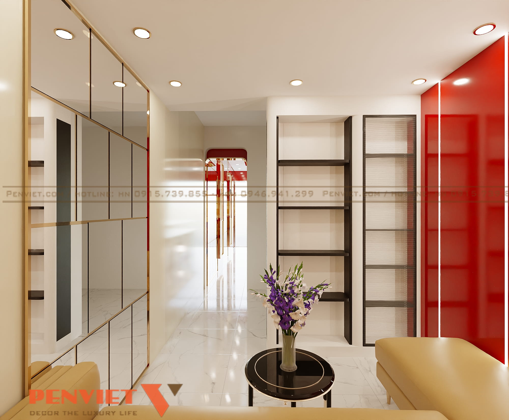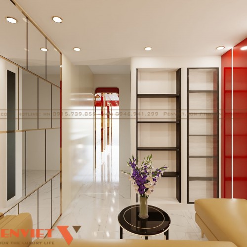 Gam màu đỏ chủ đạo kết hợp trắng và ánh kim tạo hiệu ứng sang trọng. Màu sắc giúp nhận diện thương hiệu tốt hơn. Bề mặt vật liệu bóng tăng độ phản chiếu ánh sáng. Tổng thể mang đến cảm giác cao cấp, hiện đại.