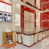 Quầy trưng bày được đặt theo dạng đảo kết hợp tường. Kính trong suốt giúp khách dễ quan sát sản phẩm. Chiều cao quầy hợp lý tạo sự thoải mái khi giao dịch. Các góc cạnh được bo tròn tăng tính an toàn.
