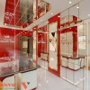 Hệ gương lớn hai bên tạo chiều sâu cho không gian. Đồng thời giúp khách thử trang sức thuận tiện. Các poster hình ảnh được bố trí hợp lý, tăng tính thẩm mỹ. Không gian trở nên sinh động hơn.