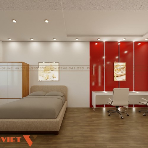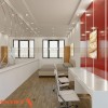 Logo và bảng tên được đặt tại vị trí dễ nhìn. Mảng tường đỏ phía sau giúp thương hiệu nổi bật. Thiết kế đơn giản nhưng hiệu quả cao. Khách hàng dễ ghi nhớ ngay từ lần đầu ghé thăm.