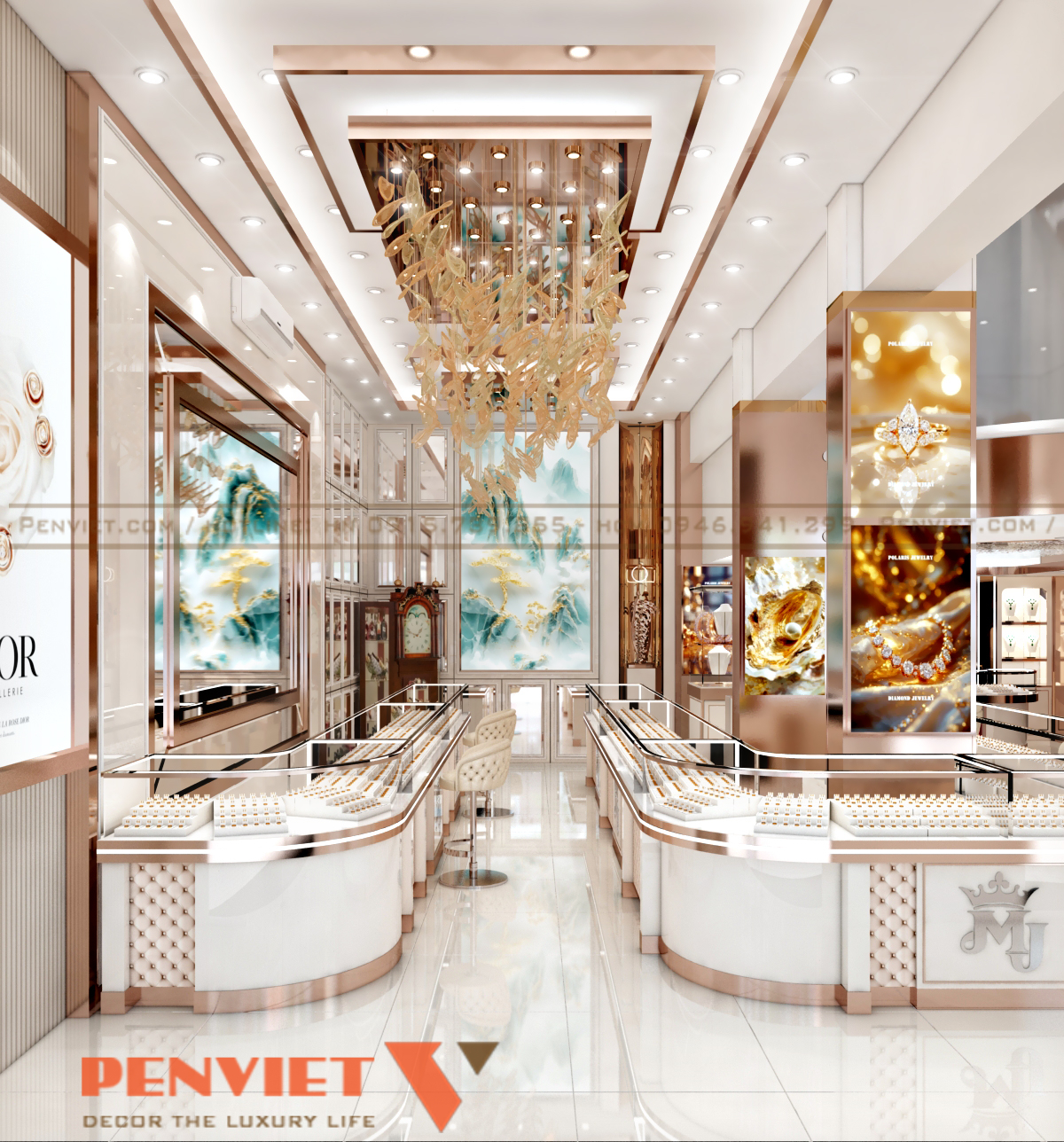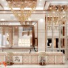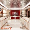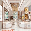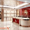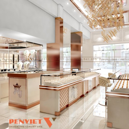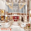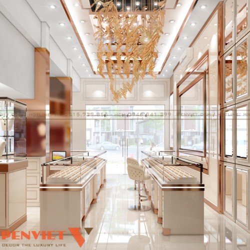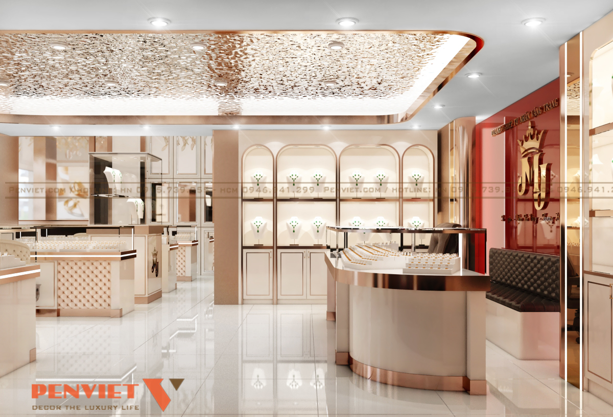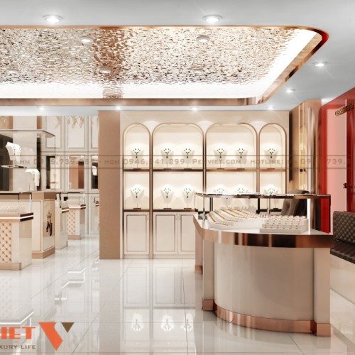 Hệ đèn LED tập trung vào từng khay trưng bày giúp trang sức nổi bật hơn. Ánh sáng trắng kết hợp vàng tạo hiệu ứng lung linh, tăng giá trị cảm nhận. Trần trang trí với lớp ánh kim tạo chiều sâu và điểm nhấn sang trọng. Mọi nguồn sáng đều được tính toán để không gây chói.