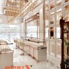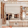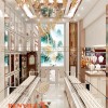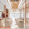 Thiết kế sử dụng trần cao, ánh sáng đa lớp giúp không gian luôn sáng và thoáng. Tông trắng kết hợp kim loại ánh vàng tạo cảm giác cao cấp, sạch sẽ. Khu vực trung tâm được mở rộng, tạo trục nhìn thẳng vào quầy chính. Logo thương hiệu đặt nổi bật, tăng khả năng ghi nhớ ngay từ khi bước vào.