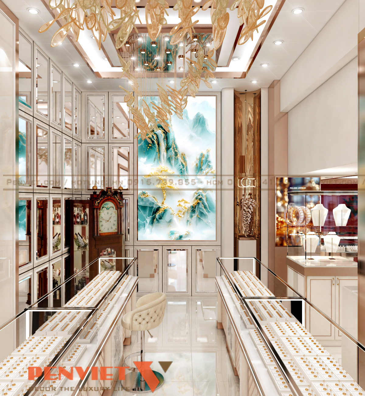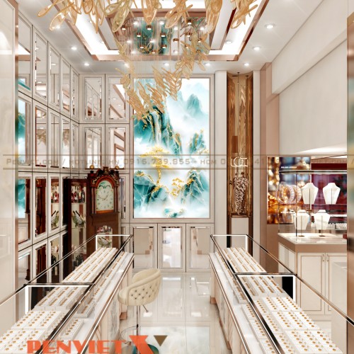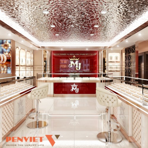 Các mảng tường được xử lý phẳng, kết hợp phào chỉ nhẹ để tăng chiều sâu. Vật liệu kính và kim loại phản chiếu giúp không gian rộng hơn thực tế. Hệ đèn thả trần tạo điểm nhấn mềm mại, thu hút ánh nhìn. Tổng thể phù hợp định vị tiệm vàng cao cấp tại Nam Định.