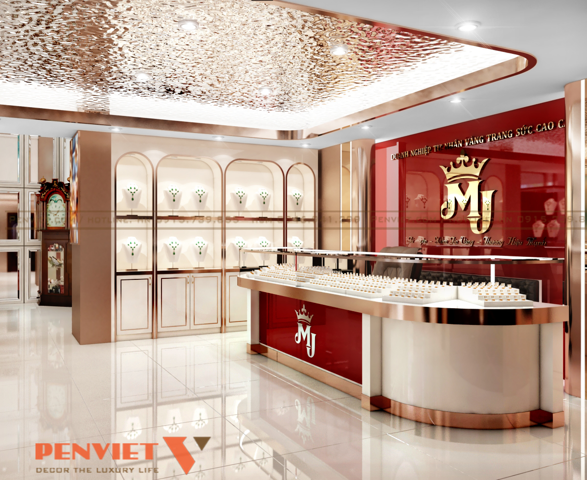 Hình ảnh thương hiệu được thể hiện xuyên suốt qua màu sắc và logo. Thiết kế đồng bộ giúp tiệm vàng trở nên chuyên nghiệp hơn trong mắt khách hàng. Hệ tủ linh hoạt giúp dễ dàng thay đổi layout khi cần. Đây là lợi thế lớn cho chủ đầu tư khi muốn mở rộng hoặc nâng cấp sau này.