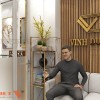 Thiết kế khu vực tiếp khách tại Vinh Dương là một trong những điểm nổi bật đáng khen ngợi. Không gian bố trí 2 bộ bàn ghế sofa đơn, bọc nệm màu xám tro với chân ghế ánh kim tạo cảm giác thân thiện, dễ chịu và lịch sự. Các bộ bàn nhỏ đi kèm có mặt đá và chân kim loại đồng bộ, vừa tiện nghi vừa tôn lên nét thẩm mỹ.