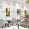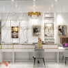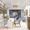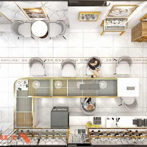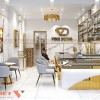 Ngay khi bước vào tiệm, khách hàng sẽ cảm nhận được không gian mở, sáng sủa, sang trọng với tông màu chủ đạo là trắng và vàng. Gạch lát sàn màu trắng bóng kết hợp với tường giả đá vân mây tạo hiệu ứng không gian rộng rãi và sạch sẽ. Những chi tiết viền vàng kim loại được sử dụng khéo léo tại các điểm giao giữa tường và kệ trưng bày, tạo cảm giác tinh tế, chỉn chu mà không phô trương.