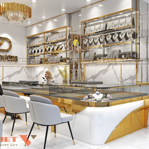 Khu vực trưng bày sản phẩm được thiết kế hình chữ L với mặt kính cường lực trong suốt, cao vừa tầm mắt để khách dễ dàng quan sát. Hệ tủ kính có đường viền ánh kim, tôn lên vẻ đẹp của các món trang sức vàng, bạc, kim cương đang được bày bán.