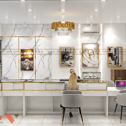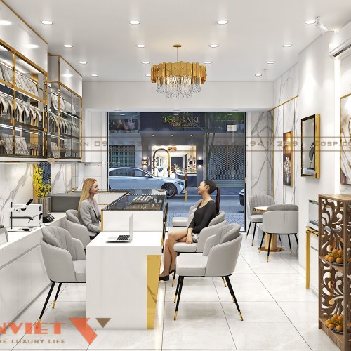Khu tiếp khách ở bên trái, vừa là nơi đón tiếp vừa giúp khách có thời gian lựa chọn, quan sát sản phẩm. Trung tâm là hệ tủ kính trưng bày cùng bàn làm việc, máy tính, máy in, thiết bị thanh toán, đảm bảo giao dịch diễn ra thuận tiện.