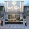 Khu vực mặt tiền của tiệm được thiết kế bố trí cân đối, hai bên là bồn cây cảnh xanh mát, tạo điểm nhấn sinh khí cho không gian. Hệ thống vách kính cường lực trong suốt phía trước cửa tạo sự kết nối không gian giữa bên trong và bên ngoài.