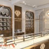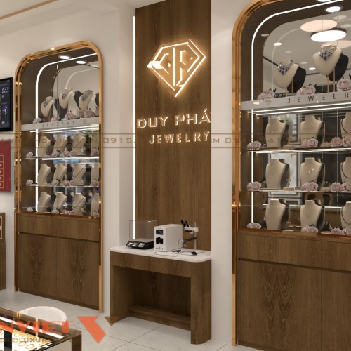Bước vào bên trong, tâm điểm của toàn bộ không gian thiết kế tiệm vàng Duy Phát là hệ tủ trưng bày trang sức hiện đại. Tủ được bố trí theo hình chữ U gọn gàng, hướng về trung tâm. Chất liệu chính là gỗ tự nhiên kết hợp kính cường lực trong suốt, tạo nên sự sang trọng, bền bỉ và dễ bảo trì.