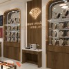 Phía trên khu vực này là tranh trang trí khổ lớn mô phỏng các sản phẩm trang sức cao cấp và thể hiện rõ phong cách thiết kế luxury xuyên suốt tiệm. Không gian không chỉ để nghỉ chân mà còn giúp khách hàng thư giãn, quan sát kỹ sản phẩm, cảm nhận được sự chuyên nghiệp từ từng chi tiết.