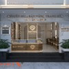 Cuối không gian chính là vách logo trung tâm, được thiết kế như một “ngai vàng” biểu trưng cho uy tín và đẳng cấp. Vách được ốp đá giả marble màu kem vàng vân mây trang nhã và sang trọng. Bao quanh là khung viền kim loại mạ vàng sáng bóng, chạy theo đường cong mềm mại, biểu tượng cho sự thịnh vượng bền vững.