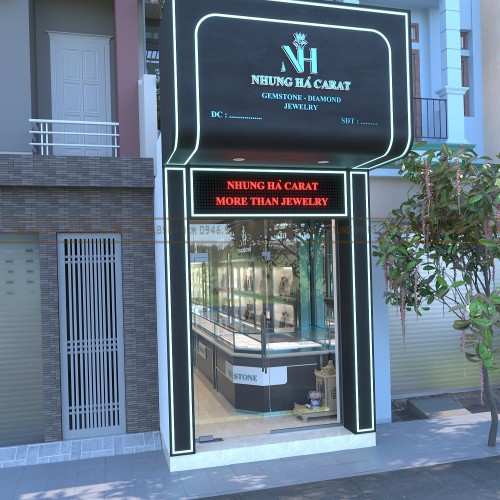 Tiệm vàng Nhung Hà nổi bật trên phố thị bởi hệ thống biển bảng gam màu đen cá tính. Đường viền trắng xuyên suốt tấm biển quảng cáo tạo điểm nhấn nổi bật trên nền đen tuyền. Bên cạnh đó, trên biển bảng còn có bộ logo và tên thương hiệu “ Nhung Hà Carat” nhằm tăng nhận diện thương hiệu.