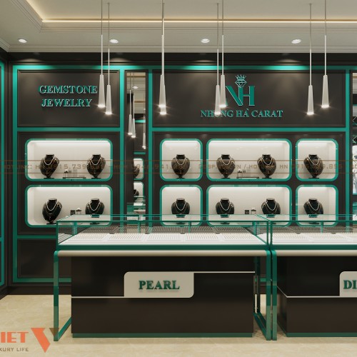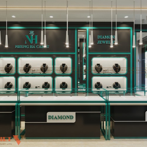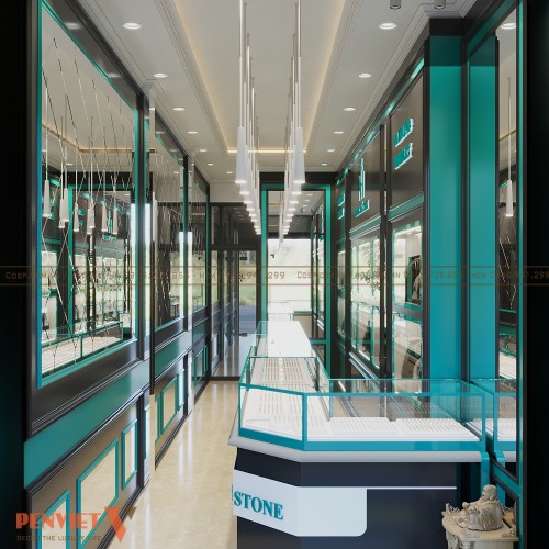 Bên trong cửa hàng bố trí quầy trưng bày hình chữ L đặt sát góc tường bên phải. Với gam màu đen xanh hòa trộn mang đến màu sắc mới lạ cho cửa hàng trang sức.