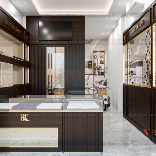 Nhằm đáp ứng những tiêu chí thẩm mỹ truyền thống của chủ đầu tư, chúng tôi sử dụng vật liệu chính là gỗ công nghiệp với vân màu nâu đậm cho cửa tiệm. Cách bài trí không gian khoa học kết hợp những đường nét thiết kế tinh tế, khiến chúng ta vừa có cảm giác thân thuộc, gần gũi, lại vừa cảm nhận được sự mới mẻ của không gian.