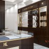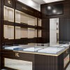 Các vách kế tủ kệ bằng gỗ Melamine được thi công tạo rãnh mang đến sự mới mẻ, độc đáo cho thiết kế cửa hàng vàng.