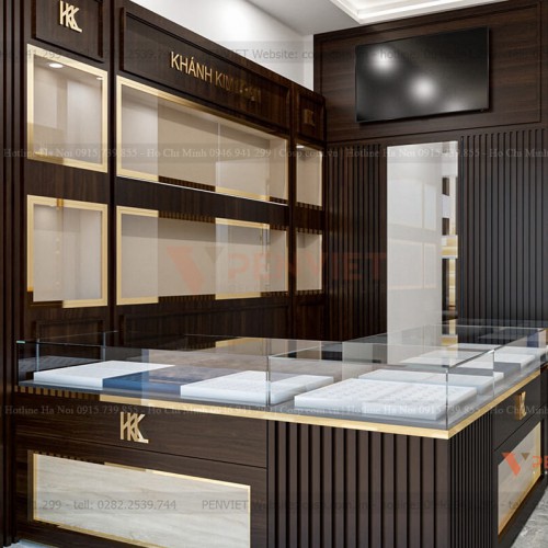 Thay vì tủ trưng bày dạng chữ I thường thấy, Penviet lựa chọn thiết kế tủ chữ L bằng gỗ Melamine với kính cường lực dày 10mm được mài cạnh, vừa mang đến sự sang trọng, hiện đại, vừa đảm bảo an toàn cho những món trang sức giá trị. Chúng tôi cũng không quên bố trí hệ thống đèn led bên trong các đợt tủ để tôn lên vẻ đẹp lung linh, tinh tế của sản phẩm.