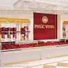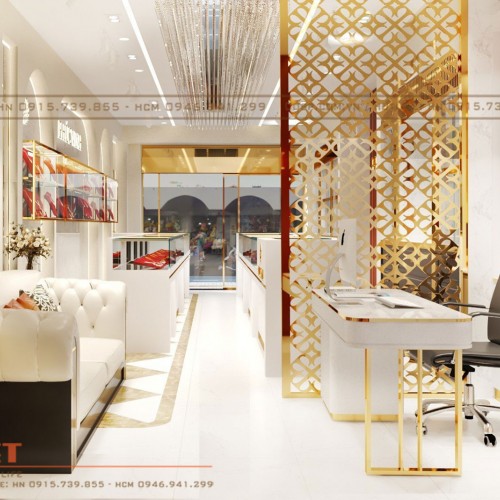 Ý tưởng: tông màu chủ đạo là trắng và đỏ kết hợp nẹp chỉ inox mạ xi vàng làm cho không gian trở nên nổi bật, sang trọng và thu hút khách. Các tủ trưng bày sản phẩm được làm từ kính cường lực trong suốt đảm bảo tính thẩm mỹ đồng thời đáp ứng được cả tính an toàn. Sử dụng nền đá tone màu sáng làm nổi bật sự sang trọng của cửa hàng. Đèn downlight và đèn thả trang trí giúp đem đến ánh sáng trong cửa hàng, đặc biệt là tạo hiệu ứng lung linh cho các sản phẩm trang sức.