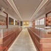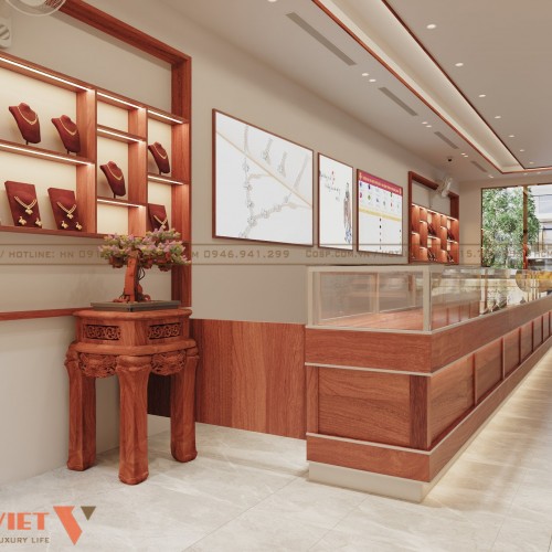 Ngoài ra, PenViet còn gợi ý sử dụng gương ghép trang trí nẹp gỗ cho diện tường bên phải của tiệm vàng. Đây là phương án vừa tạo hiệu ứng rộng mở cho không gian vừa tạo tính thẩm mỹ, giúp khách hàng thuận tiện để chiêm ngưỡng bản thân khi thử trang sức.