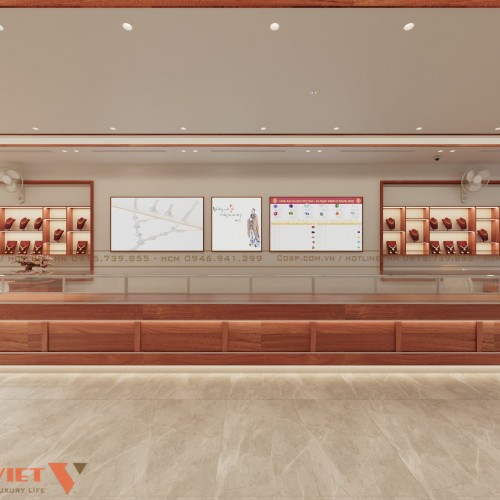 Bước chân vào bên trong tiệm vàng bạn sẽ nhìn thấy hệ quầy kệ trưng bày kích thước lớn. Quầy làm từ chất liệu gỗ MDF phủ melamine chống ẩm hiệu quả kết hợp kính cường lực trong suốt. Đây là vật liệu khá phổ biến mà nhiều cửa hàng kinh doanh trang sức lựa chọn. PenViet sử dụng 2 quầy hình chữ L đặt sát 2 bên để tối ưu diện tích sử dụng đồng thời tạo lối đi thoải mái chính giữa.
