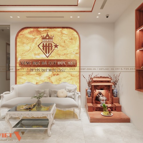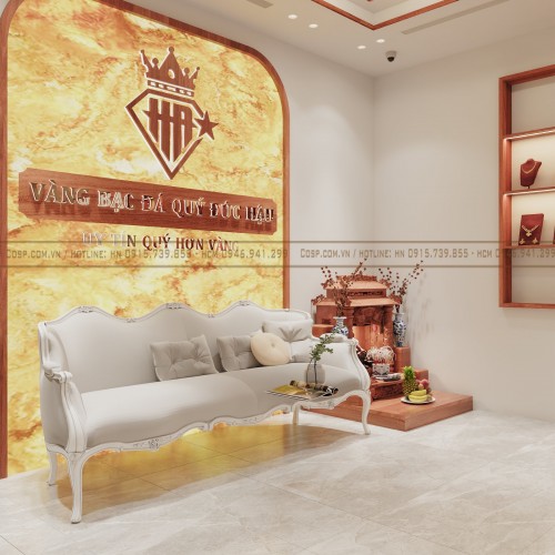 Phía sau của bàn ghế là vách logo thương hiệu bằng tấm ốp PVC xuyên sáng cùng nẹp viền gỗ. Bộ chữ:" Vàng bạc đá quý Đức Hậu", bộ chữ:" Uy tín quý hơn vàng" làm bằng chân mica phát sáng, mặt inox vàng gương. Bộ logo làm bằng chân mica phát sáng, mặt inox vàng gương. Với cách thiết kế này sẽ tăng độ nhận diện để khách hàng ghi nhớ hơn về tiệm vàng Đức Hậu.