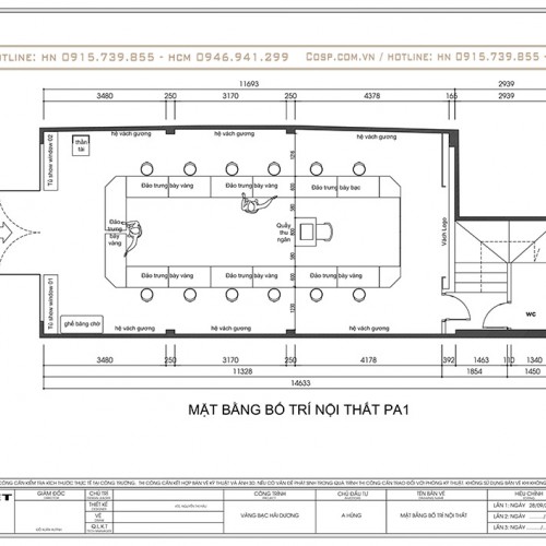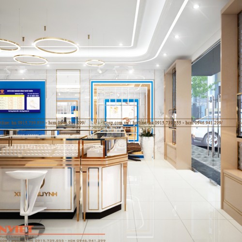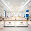 Để phát huy hết các ưu điểm về mặt tiền rộng rãi, các kiến trúc sư của chúng tôi đã “biến hóa” phần mặt tiền bên trong thành khu vực trưng bày trang sức cao cấp, thu hút mọi ánh nhìn của khách hàng. Penviet lựa chọn tủ show-window bằng kính cường lực dày, phía dưới là bục gỗ MDF lõi xanh chống ẩm sơn Inchem, in logo bằng Alu vàng gương kết hợp giá Inox mạ PVD vàng gương, dán kính decal tinh tế và ấn tượng.