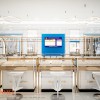 Điểm độc đáo trong mẫu thiết kế tiệm vàng này là Penviet đã lựa chọn hệ vách gương xung quanh không gian với họa tiết vân đá nhằm tạo hiệu ứng mở rộng không gian, đặc biệt sự phối hợp này tạo nét hài hòa làm nổi bật gam màu trắng - vàng - xanh của tiệm trang sức Xuân Quỳnh.