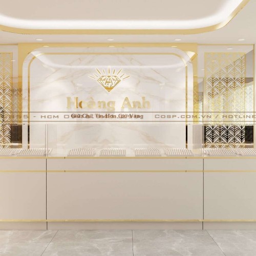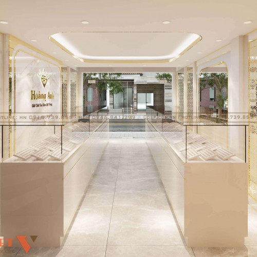 Ngay khi bước vào cửa tiệm trang sức Hoàng Anh, quý khách sẽ cảm thấy sự chuyên nghiệp bởi từ cách bố trí nội thất quầy kệ và các vách trang trí. Trong đó, PenViet sử dụng hệ 2 tủ chữ L đặt sát 2 bên tạo lối đi chính giữa thoải mái để khách hàng dễ di chuyển.
