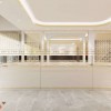 Cuối cửa hàng có bố trí bàn ghế đón tiếp khách, tư vấn hỗ trợ khách VIP. Bàn ghế sofa đơn màu trắng sang trọng, chân inox sơn tĩnh điện màu vàng. Kết hợp phía sau là vách logo đồng điệu với tổng thể.