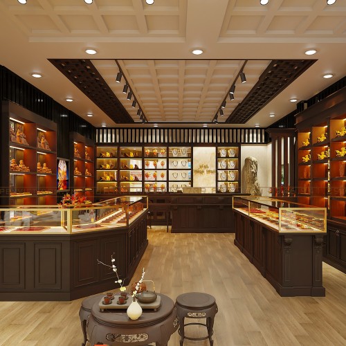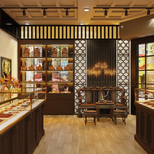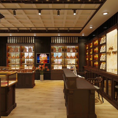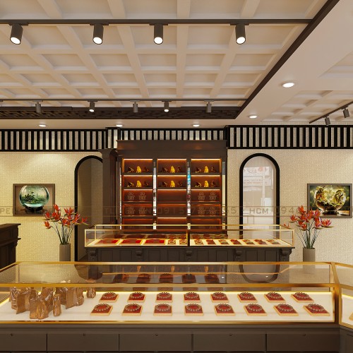 Mẫu thiết kế nội thất tiệm vàng phong Thủy Thành Vinh do PenViet triển khai mang màu sắc trầm ấm, sang trọng. Do mặt hàng kinh doanh là đá quý phong thủy nên chủ đầu tư chọn phong cách thiết kế indochine đông dương đơn giản. Cùng điểm qua một số điểm nhấn của cách trang trí nội thất này dưới đây.