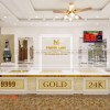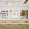 Hai bên tường của tiệm vàng ốp kính thủy cắt họa tiết cá tính giúp không gian trở nên rộng rãi hơn nhờ sự phản chiếu từ gương soi. Đây là một trong những phương án decor thông minh mà nhiều tiệm vàng áp dụng.