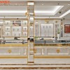 Gương thủy bi hậu gỗ MDF, viền Inox mạ xi vàng được dùng trong mẫu thiết kế tiệm vàng này không chỉ giúp khách hàng có thể chiêm ngưỡng vẻ đẹp của mình khi diện những mẫu trang sức cao cấp mà còn khiến cho không gian trở nên sang trọng.
