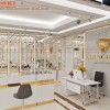 Vách tường sau bàn làm việc ốp đá Marble, viền Inox mạ xi vàng kết hợp đèn Led tôn lên bộ nhận diện thương hiệu bằng Inox mạ xi vàng.