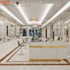 Tủ trưng bày chính bằng gỗ MDF chống ẩm phun sơn và kính cường lực vừa mang đến vẻ hiện đại cho mẫu thiết kế tiệm vàng Kim Nguyên.