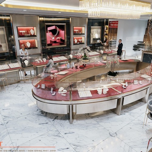 Hệ thống tủ quầy kệ của tiệm vàng được thiết kế với độ chế tác tinh xảo rất cao. Chất liệu gỗ MDF An Cường cốt xanh chống ẩm phủ lamilate kết hợp mặt kính cường lực 10mm, mặt đáy tủ ốp nỉ nhung, đèn led thanh chạy dọc 4 cạnh tủ vừa giúp tôn lên vẻ đẹp lung linh của mặt hàng trang sức, vừa đảm bảo an toàn tuyệt đối cho sản phẩm