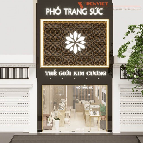 Penviet khéo léo giúp Thế giới kim cương Trang Sức Phố tăng cường nhận diện thương hiệu nhờ setup vách logo thu hút với tấm nền MDF chống ẩm, tranh backlist mặt ngoài bằng kính và nhận diện thương hiệu bằng Mica Đài Loan phát sáng.
