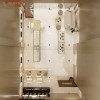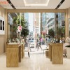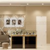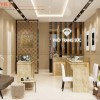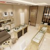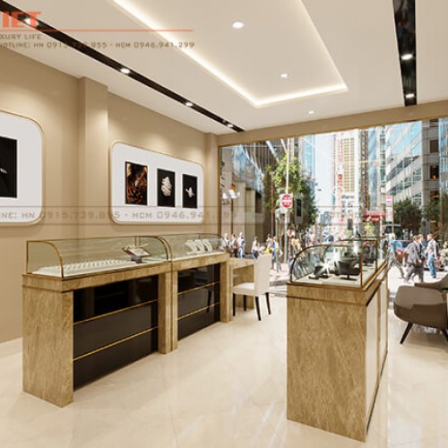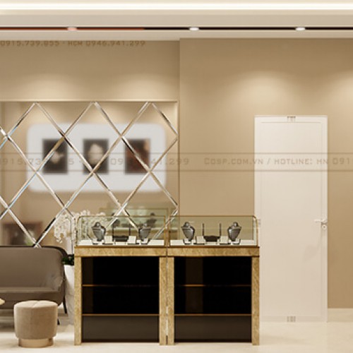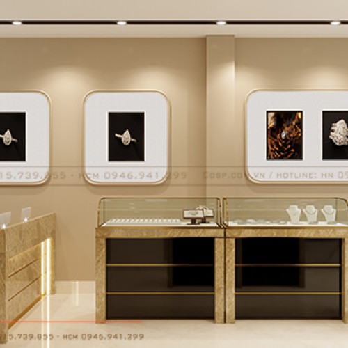 Phong cách hiện đại được Penviet tư vấn cho khách hàng để setup cửa tiệm. Với kinh phí eo hẹp, phương án được chúng tôi lựa chọn là sử dụng gỗ công nghiệp làm vật liệu chính cho thiết kế nội thất cửa hàng kim cương này. Sự sang trọng của cửa hiệu sẽ được tạo nên nhờ việc sử dụng màu sắc như màu nâu, nhũ vàng…và các họa tiết vân đá.