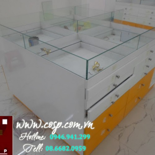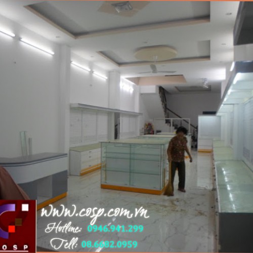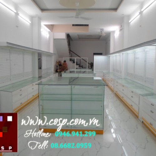 Với màu sắc chủ đạo của cửa hàng là trắng và vàng. Nội thất của cửa hàng bao gồm:- 1 Quầy thu ngân. Tủ trưng bày giữa nhà với mặt kính chịu lực. Cùng hệ thống tủ sát tường có ngăn kéo và lưới có trang trí hộp đèn