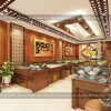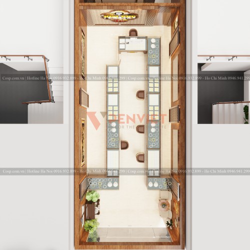 Đến với phần quan trọng của bản thiết kế, đó là không gian của tiệm vàng Kim Phú. Phần trần được ốp gỗ MDF phủ melamine cắt CNC, nẹp 10cm theo mép thạch cao. Có những chiếc đèn âm trần 12V với ánh sáng trắng cao cấp. Ngoài ra có một bộ đèn chùm ở giữa, tạo điểm nhấn cho không gian, sang trọng hơn. Để không gian được đồng bộ với nhau, tường nhà sẽ sử dụng giấy gián tường Nhật có những vẫn gỗ khá thật và bắt mắt.
