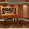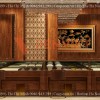 Có thể thấy bản thiết kế được chăm chút tỉ mỉ, trên tường KTS còn đưa thêm những vách CNC sáng mặt, khung gỗ MDF chống ẩm Thái Lan phủ melamine, alu vàng gương. Vách với những đường họa tiết cầu kì và có hệ thống đèn led chuyên xuyên sáng phía sau. Làm cho không gian có đường nét hơn, có bố cục và đẹp mắt hơn.