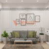 Tiếp đến là không gian tiếp khách chính. Một bàn trà hình chữ nhật mặt đá tự nhiên, chân sắt inox mạ vàng nhỏ xinh kèm theo đó là bộ sofa màu ghi êm ái giúp khách hàng có được sự êm ái khi ngồi xuống. Phần không gian này được trang trí bởi một số chậu cây xanh tươi tắn kèm theo một số tranh decor sinh động treo trên tường.