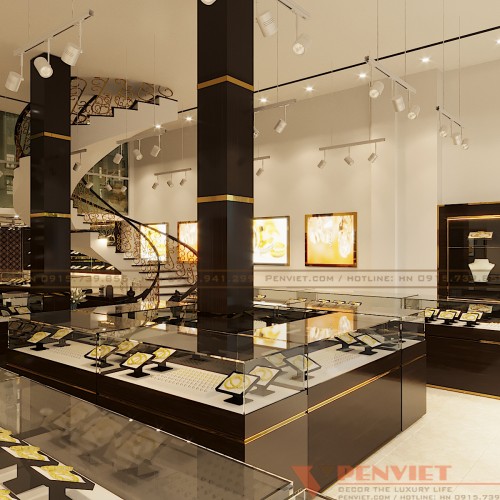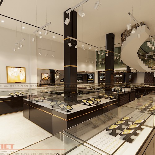 Chưa hết, với hệ thống đèn rọi, đèn downlight ánh sáng vàng nhạt, khách hàng sẽ cảm thấy thuận tiện hơn trong việc quan sát sản phẩm. Hệ thống đèn này còn đảm nhận một vai trò không hề nhỏ đó là mang lại cho không gian nội thất của shop một màu sắc trung tính, chuyên nghiệp và hơn hết là giá trị của các sản phẩm vàng, bạc được tôn lên rất nhiều.