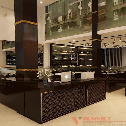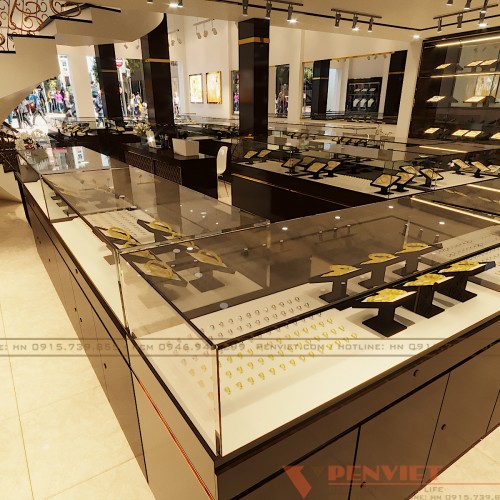 Không chỉ vậy, trên thân tủ còn được tô điểm bằng những đường viền màu vàng ánh kim càng tăng thêm vẻ sang trọng. Những chiếc tủ kính được sắp xếp một cách rất khoa học, tạo lối đi thuận tiện cho khách hàng. Bên cạnh đó việc quan sát và lựa chọn sản phẩm của khách hàng cũng trở nên dễ dàng với nhiều vị trí đứng hơn.