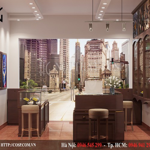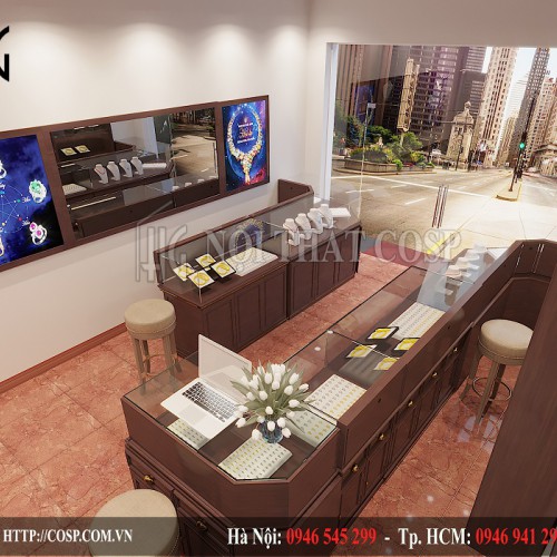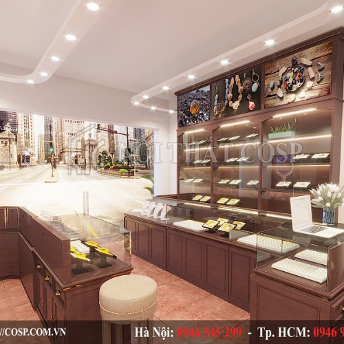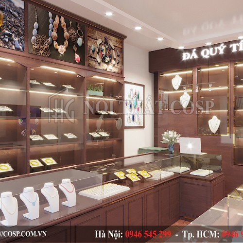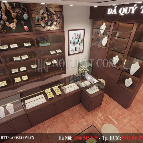 Ngay khi vừa bước vào bên trong shop, các bạn sẽ cảm nhận được ngay sự sang trọng và đẳng cấp qua từng đường nét, chi tiết nội thất. Ở gần cửa ra vào là hai hệ tủ kính trưng bày với kiểu dáng chữ L chuyên nghiệp ở hai bên. Thân tủ được làm bằng chất liệu gỗ công nghiệp melamine cao cấp với màu sơn nâu đậm vô cùng sang trọng. Mặt kính trong suốt cũng là một chi tiết tôn lên vẻ đẳng cấp của shop khi những mặt hàng đá quý được trưng bày dưới tấm kính đều trở nên lộng lẫy hơn rất nhiều.