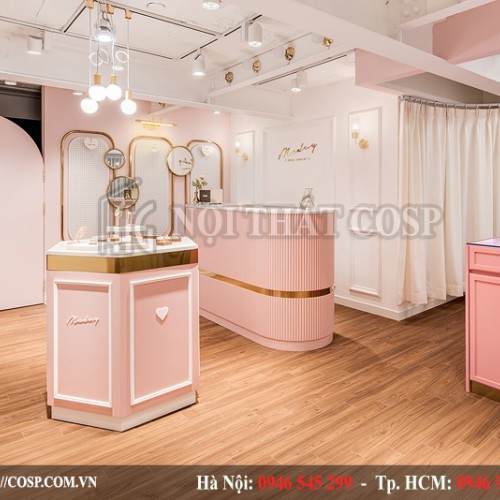 Hệ nội thất được thiết kế với những bàn trưng bày có tone màu đồng điệu được làm từ chất liệu gỗ MDF cao cấp, kết hợp với sắt mạ crom vàng sáng khiến thiết kế nội thất shop nữ trang được xuyên suốt và hài hòa hơn.